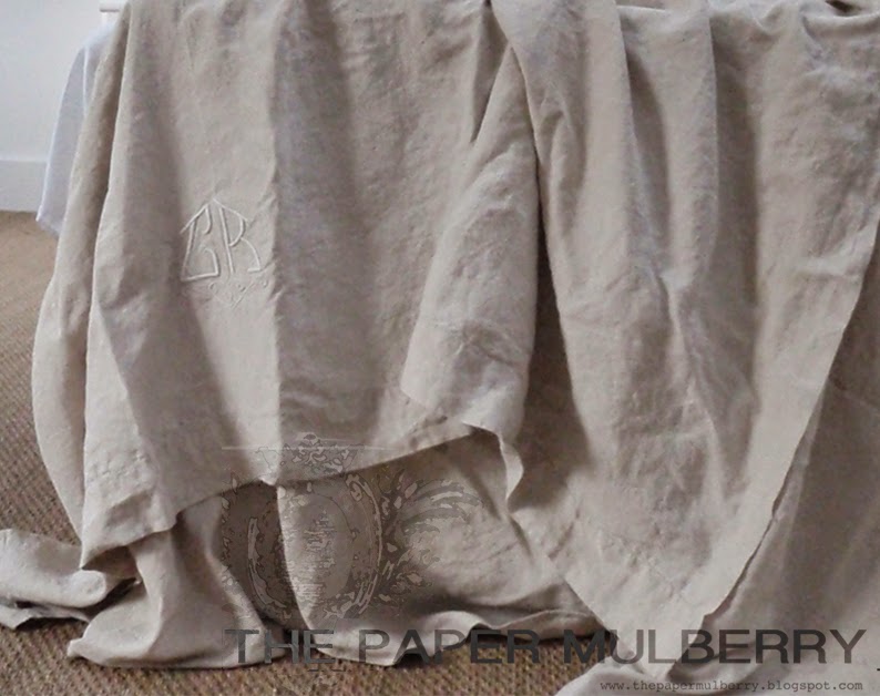 Vintage monogrammed linen sheet used as a bed drape as the length is particularly good for this purpose and the texture and weight of the linen sublime!