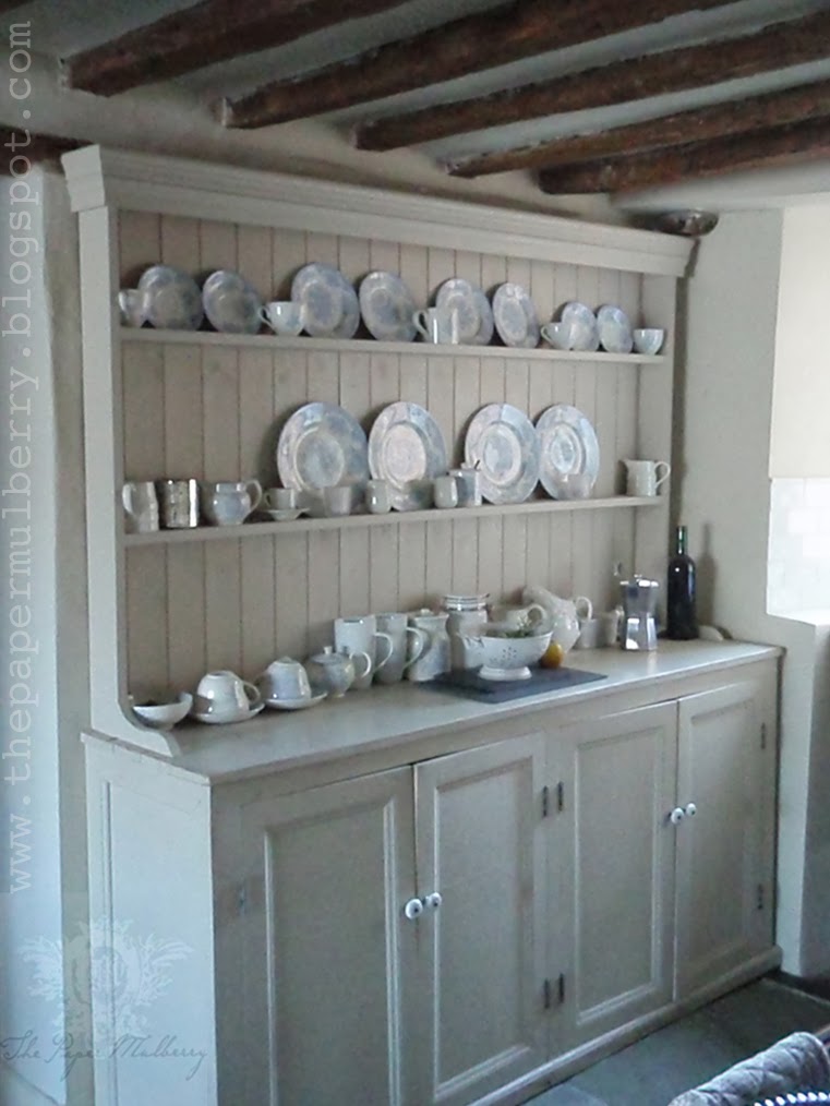 Above image: the kitchen - we "unfitted" the kitchen my Husband made this dresser Paint shades: main walls in Off White No 3, the dresser is Stony Ground both Farrow and Ball the china is Asiatic Pheasants by Burleigh