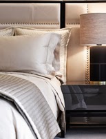 Above image: glamorous vertical padded "Portland" headboard edged in silver in shades of oyster by LuxDeco | Shagreen bedside cabinet and "Walton" cushions all from LuxDeco